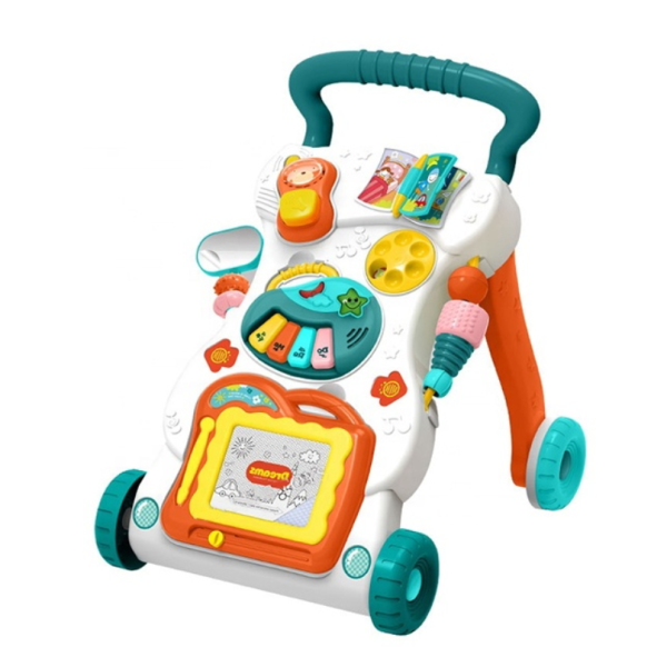 Acest carusel colorat și atractiv este realizat sub forma unui arc flexibil, care se atașează cu ușurință la pătuț sau cărucior. În partea de sus se află un OZN interactiv, dotat cu: